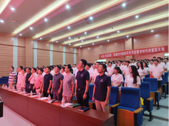 典礼开始,全体起立,师生齐唱国歌。