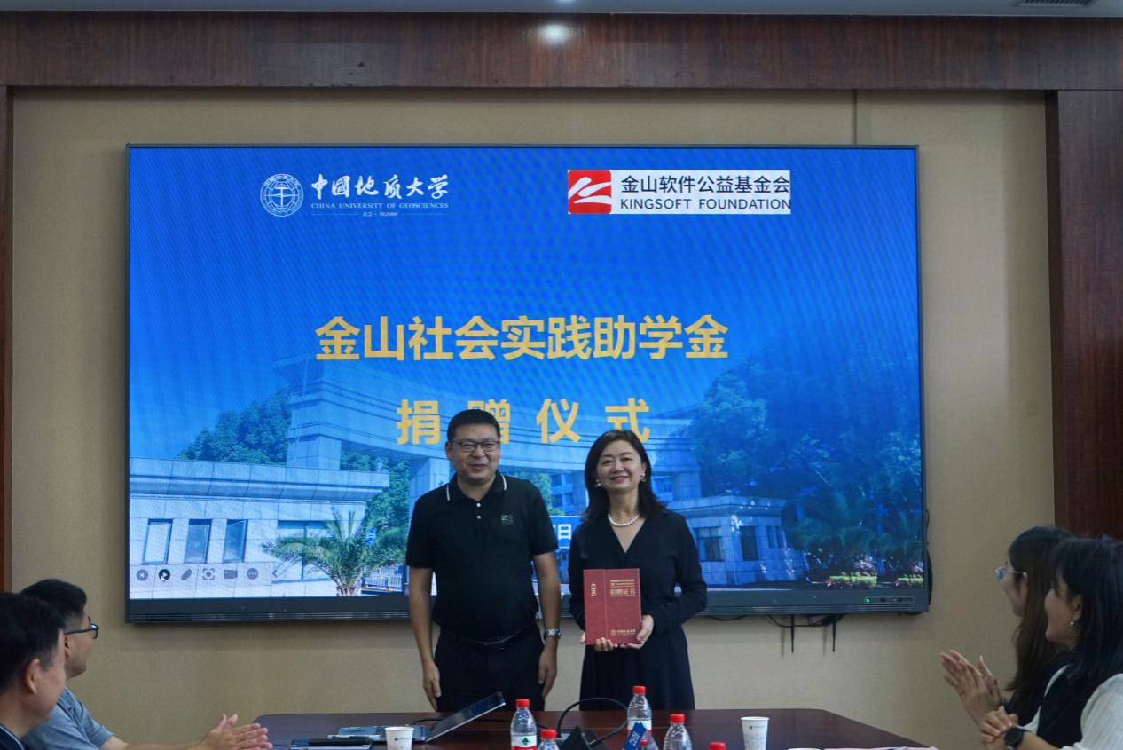在播放完学校宣传片后,王华副校长致辞。他对王全国副理事长一行的到来表示热烈欢迎,重点介绍了学校办学特色和发展成绩,感谢金山软件公益基金会在我校设立“金山社会实践助学金”、关爱地大学子,希望双方进一步加强沟通、深化合作,共同为社会培养优秀人才。