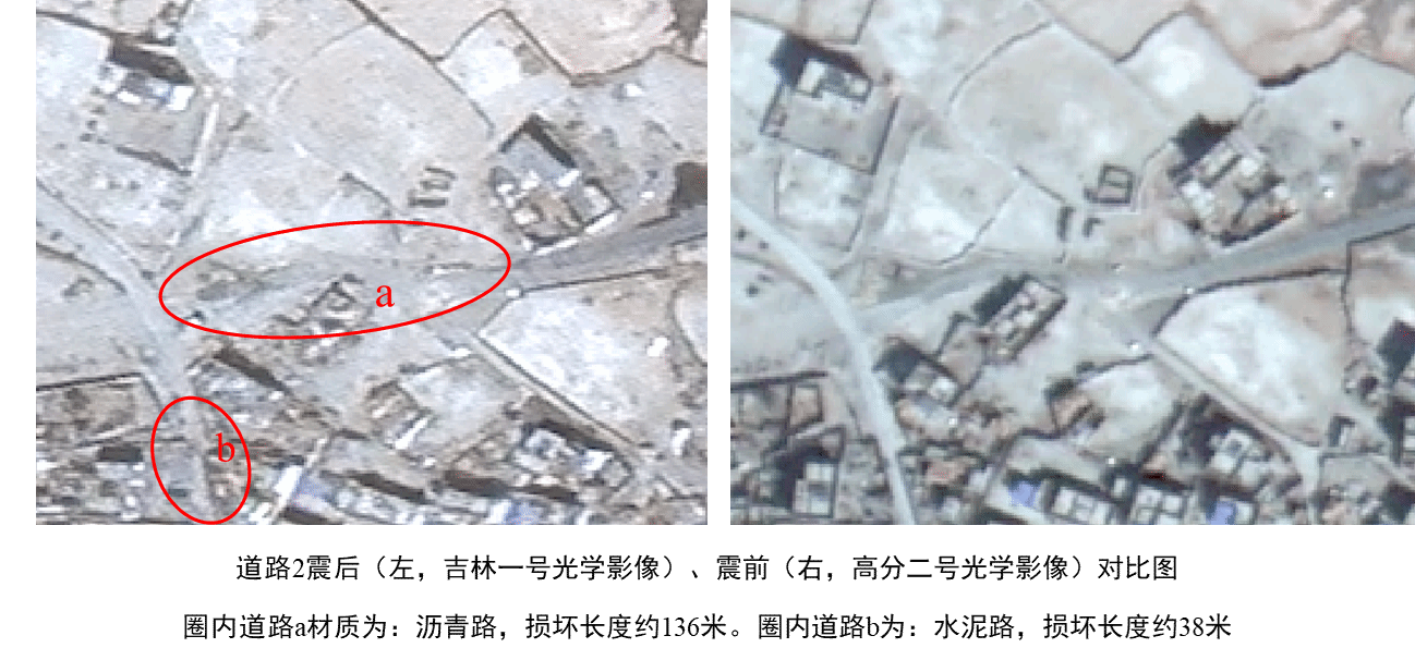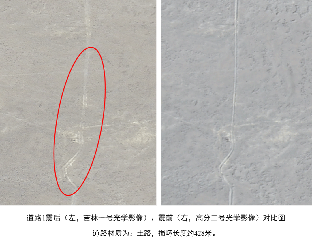 后附典型关键联村道路、交叉路口损毁区域的震前震后影像对比图。材质包括土路、水泥路和沥青路,损毁长度从数十米到数百米不等,最长可达到428米。这些能为制定精准的道路抢修和救援路线规划提供关键依据,助力救援工作顺利开展。