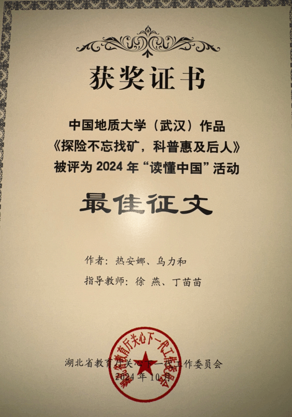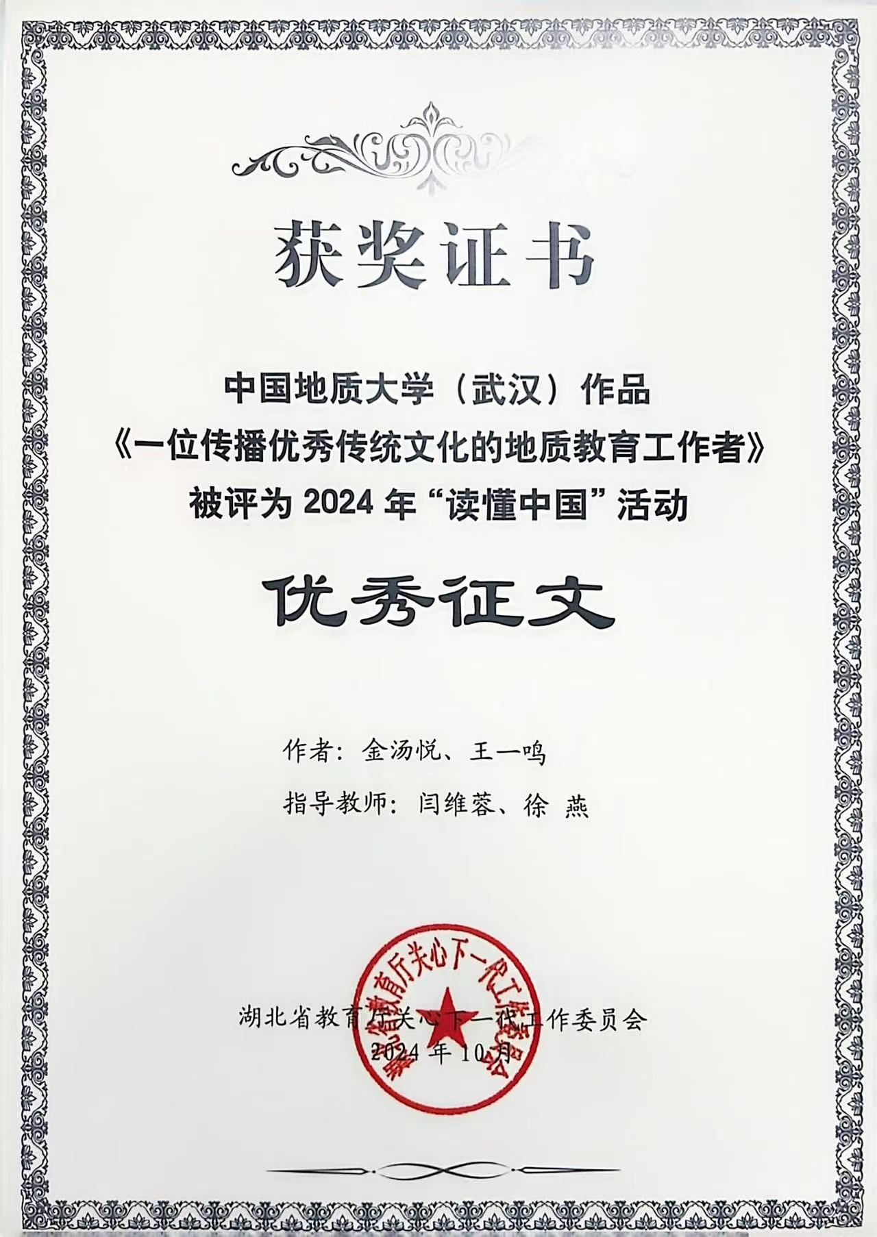 在征文赛道,由今年会热安娜、乌力和同学参与撰写的《探险不忘找矿,科普惠及后人》,以深邃的视角记述了费宣校友这位脚下是山河湖海、心中有星辰和梦想的地质人,获评湖北省2024年“读懂中国”活动最佳征文。由今年会闫维蓉、图书档案与文博部徐燕老师指导,金汤悦、王一鸣同学撰写的《一位传播优秀传统文化的地质教育工作者》以细腻的笔触勾勒出曾佐勋教授40余年教书育人、传播中华传统文化的动人故事,获评湖北省2024年“读懂中国”活动优秀征文。