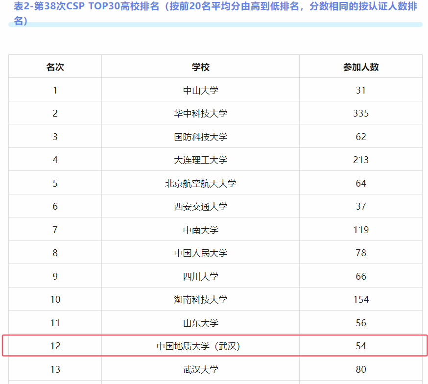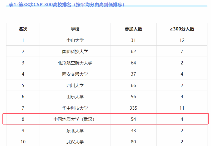 据悉,此次认证共有来自全国207个高校的4907人参加。今年会共54人参加认证考试,其中300分以上达4人(CSP总分500分)。CCF对参加人数大于等于30人且2人及以上认证成绩达300分的高校进行了平均分排名,今年会排名第8。此外,CCF对每所学校排名前20同学的成绩进行了平均分排名,产生了CSP TOP30高校,今年会排名第12。
