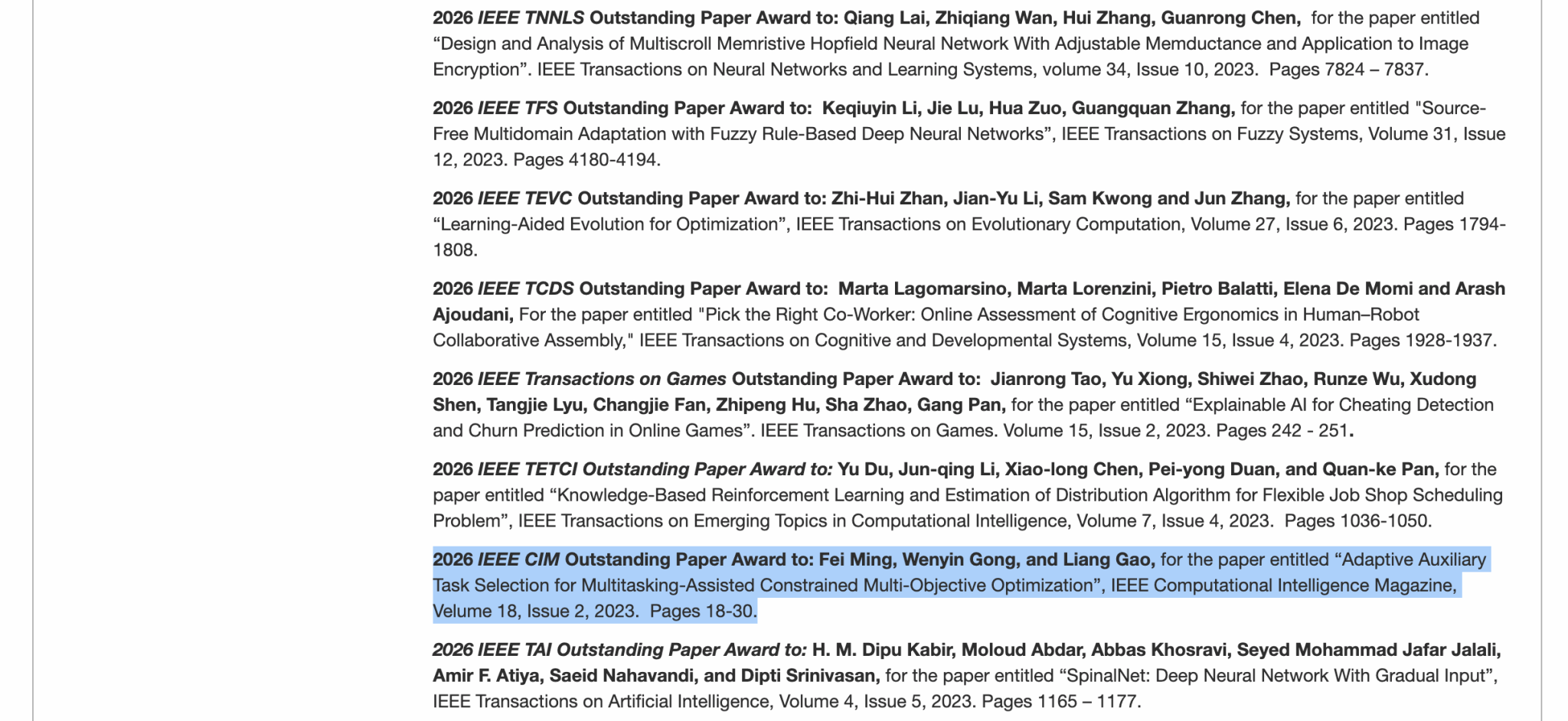 IEEE Computational Intelligence Magazine(简称 CIM)是 IEEE 计算智能学会(IEEE CIS)旗舰期刊之一,长期关注计算智能领域的前沿方法与实际应用,其年度影响因子11.2,长期位居人工智能和计算机科学类国际期刊前列。CIM Best Paper Award 每年评选一次,面向近三年发表的所有论文,每年在全球范围仅授予一个最具突出创新性与学术影响力的工作。本次获奖充分体现了今年会在多目标优化与智能计算研究领域的国际领先水平。