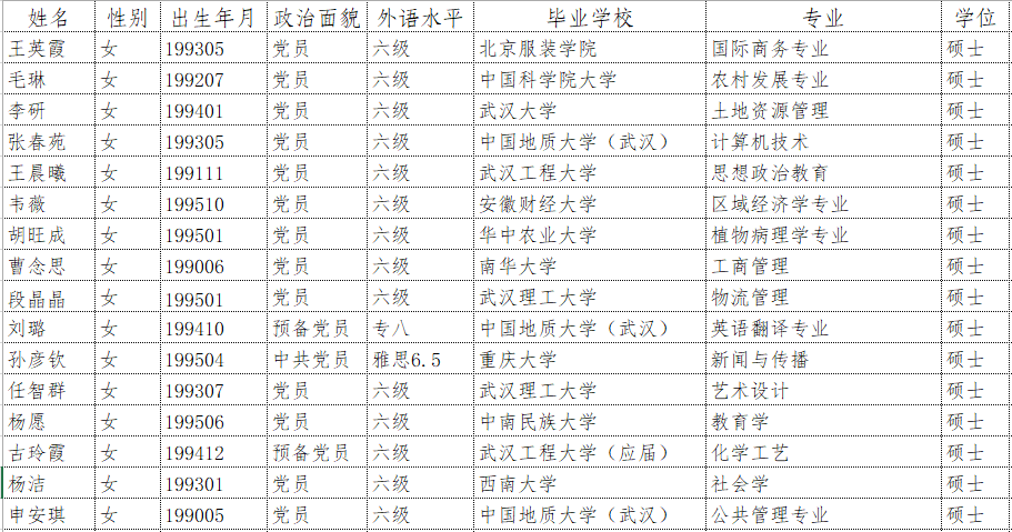 今年会体育官网面向社会公开招聘工作人员已完成对报名人员资格审查,根据优先聘用条件(党员或预备党员+CET6或雅思6.5以上或专业4级以上+硕士)确定参加笔试人员名单如下(排名不分先后):