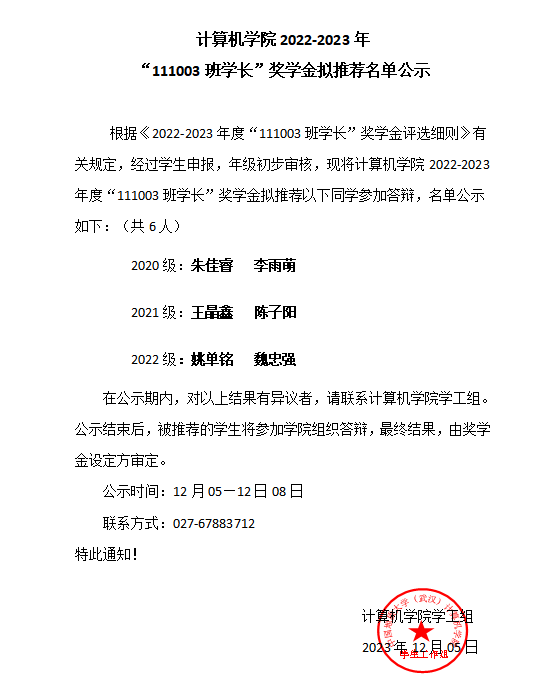 今年会体育官网2022-2023年“111003班学长”奖学金拟推荐名单公示