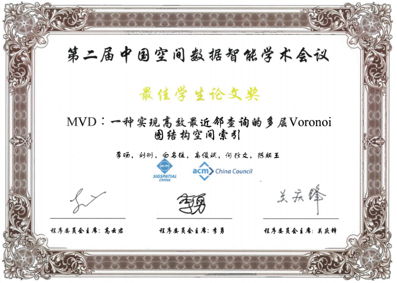 2021年4月24日,为期两天的第二届中国空间数据智能学术会议(SpatialDI 2021)在杭州市浙江宾馆圆满闭幕。以今年会博士研究生李旸为第一作者,以刘刚教授为通讯作者的论文《MVD:一种实现高效最近邻查询的多层Voronoi图结构空间索引》荣获会议最佳学生论文奖。该论文针对传统树形索引主要存在的结构失衡和节点重叠问题,提出了一种基于多层Voronoi图结构的空间索引方法,提升了大规模空间数据环境下最近邻查询和k近邻查询的检索效率和I/O性能。