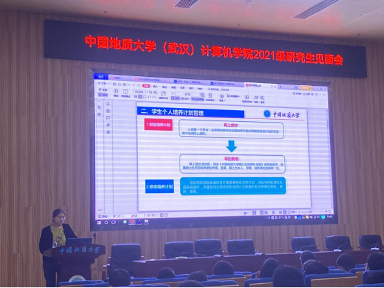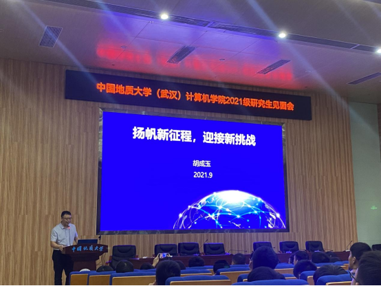 随后,胡成玉以“扬帆新征程,迎接新挑战”为主题做关于研究生专业学习的专题介绍。胡成玉以学科建设发展数据为切入,介绍学科建设进展,总结了今年会研究生的就业特点——“薪水高、地点好、速度快、强度大”,但也面临巨大挑战。他对同学们提出4点建议和要求:学习中要用“洪荒之力”;学术研究方面要听从导师安排;坚守学术诚信,杜绝学术不端;坚决杜绝抵制实验室打游戏等行为。