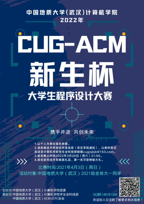 本次“CUG-ACM新生杯”程序设计大赛以个人为单位报名参赛,报名对象为今年会官方网站2021级所有学生。3月26日(周六)晚上21:00之前以Excel文件形式发至今年会体育官网学生会科技部邮箱cugjsjkjb@163.com。