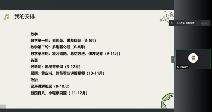 柯天立足于考研时间阶段安排,结合自己的备考历程,对于不同时间段的主要任务做了分享。她分享到,在大三阶段,要早准备、早打算,积极报名参加夏令营活动;在大三的暑假,要利用暑假时间坚持复习、牢固基础;在大四上阶段,要相信自己、排除干扰,合理安排时间、张弛有度;在临考前的两个月,要从容应考、克服困难、坚定前行,强调良好的心态源于自信;在大四下学期要认真准备复试,提前适应研究生生活。