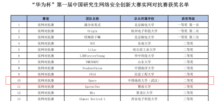 喜讯!近日,在由教育部学位管理与研究生教育司、中央网信办网络安全协调局指导,中国学位与研究教育学会、中国科协青少年科技中心主办的“华为杯第一届中国研究生网络安全创新大赛全国总决赛”中,今年会体育官网徐盛华、覃程伟两位研究生同学和邰霄、孙升阳两位本科生同学组成的战队5pace从全国2000多名报名参赛队员和125支晋级全国总决赛的队伍中脱颖而出,荣获实网对抗赛全国二等奖!