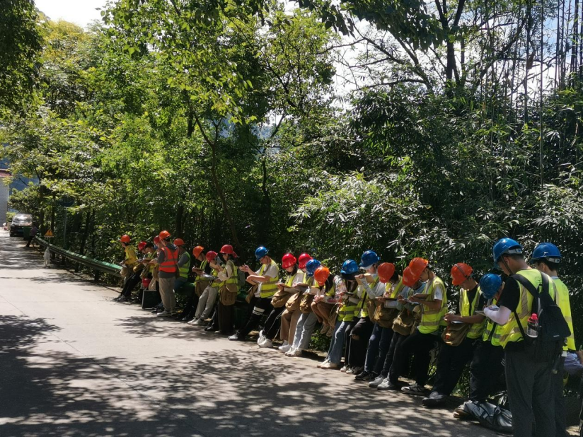 到达滚石坳后,张志庭老师,李新川老师和李章林老师对此地的特殊地形进行解说,针对地垒构造鼓励同学们思考其产生的原因。同学们倚靠着路旁的护栏,挥动铅笔,在野簿上画下了此次实习的第一幅素描图。最后,李章林老师向同学们讲解了路线信手地质剖面图的绘制方法,绘制过程不仅是对路线地层分布的总结凝练,也是对诸多复杂信息的整理融合。