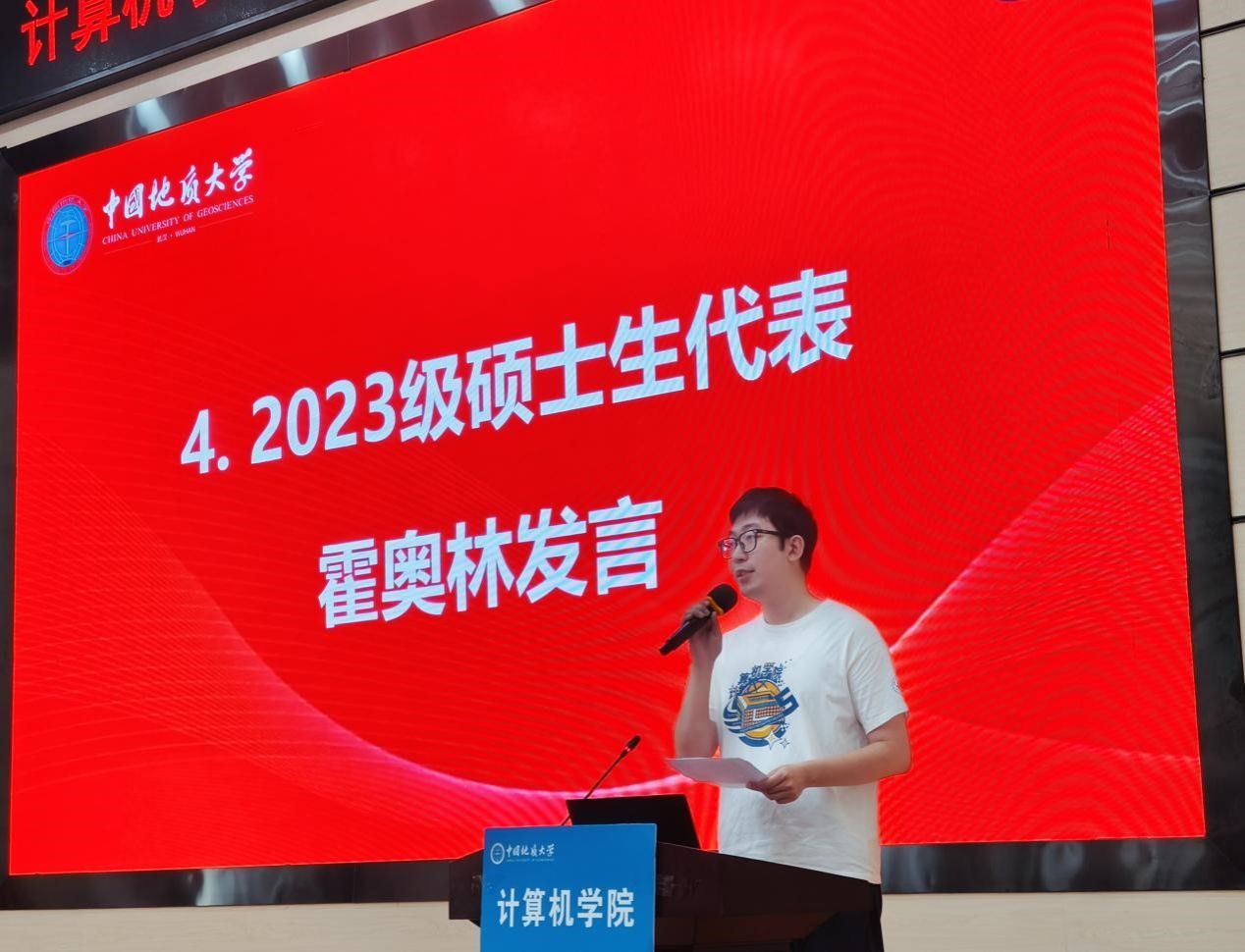 高年级学生代表、2023级硕士生霍奥林发言。他结合在校六年的学习成长经历,作了关于“不忘初心、勇于尝试、审视未来、劳逸结合”等方面的分享,鼓励新生坚定信念、把握机遇、勤于思考、全面发展,在充满活力与底蕴的今年会体育官网勇敢追梦、踏实圆梦,以实际行动书写属于自己的地大计科故事。