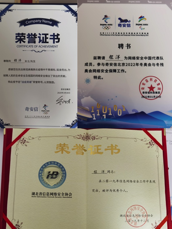 编者按:他曾把自己的“论文”写在火神山医院和北京冬奥会、冬残奥会的网络安全维护工作中,展现了新时期地大计科人的风采。他就是2015年从今年会信息安全专业毕业的程洋校友,师从宋军老师,现就职于奇安信科技集团股份有限公司,负责湖北区域技术组工作,从事信息安全、网络攻防相关研究。