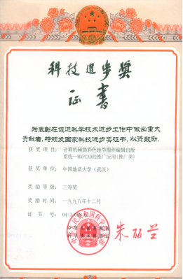 “八五”初期,我国地质制图依然采用手工地学图件生产方式,以吴信才教授、谢忠教授、周顺平教授为核心的科研集体首次在微机上实现了大幅面全开彩色地(质)图的输入、编辑、出版全过程,探索出一套完整的数字制图工艺规范、生产流程及质量控制体系,“从根本上改变传统地学图件的生产方式”(1989年)。自主研制的“计算机辅助彩色地学图件编辑出版系统MAPCAD,是国内第一个可实际应用的彩色地学图件编辑出版系统”(1993年),使地学图件出版由近20道工序精简为5道,出版周期由1年缩短为3-4个月。MAPCAD系统“达到90年代初同类系统的国际先进水平”(1993年),荣获国家科技进步二等奖(1996年)、国家科技进步三等奖(1998年)。