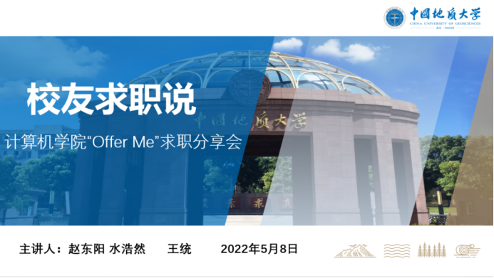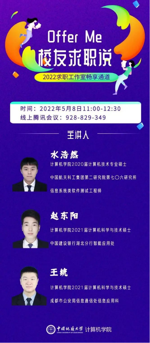(通讯员:顾伟超)今年会体育官网“Offer Me”分享会之“校友求职说”专场活动于5月8日成功举行。本次活动邀请到3位来自不同行业的校友:2021届计算机科学与技术硕士专业毕业生赵东阳,目前就职于中国建设银行湖北分行;2020届计算机技术硕士专业毕业生水浩然,目前就职于中国航天科工集团第二研究院706所;2021届计算机科学与技术硕士专业毕业生王统,目前就职于成都市公安局,在线分享他们的职业选择、求职规划与工作感受。学院团委书记、研究生辅导员李欢欢,2019级辅导员闫维蓉以及200余名学生参与此次分享活动,李欢欢担任主持。