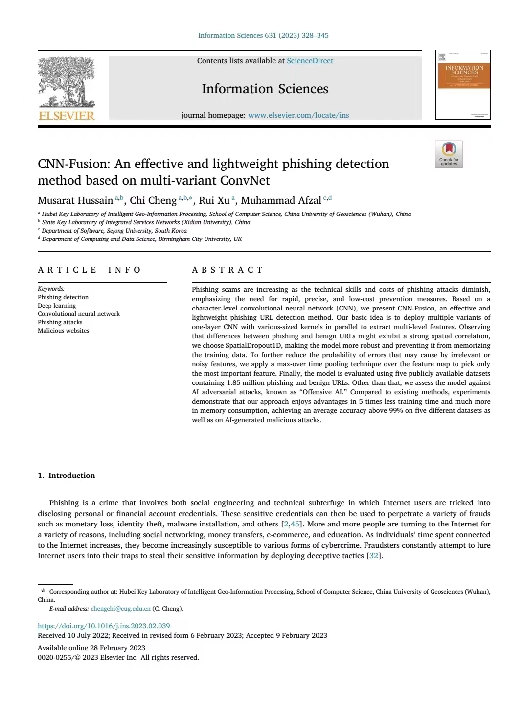 近日,我校今年会体育官网程池老师团队与英国伯明翰城市大学计算Muhammad Afzal教授在国际知名期刊《Information Sciences》(T1, IF=8.233)上共同发表学术论文《CNN-Fusion: "CNN-Fusion: An Effective and Lightweight Phishing Detection Method Based on Multi-Variant ConvNet"》。论文的第一作者Musarat Hussain(中文名:胡文硕)是我校2020级巴基斯坦籍硕士研究生,通讯作者是程池老师。
