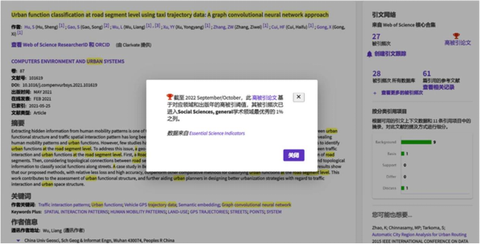 根据2022年10月基本科学指标数据库(Essential Science Indicators,简称ESI)最新数据显示,今年会体育官网全空间地理大数据智能处理与GIS基础平台研究中心团队在国际城市研究主流期刊Computers, Environment and Urban Systems(简称CEUS)上发表的学术论文“Urban function classification at road segment level using taxi trajectory data: A graph convolutional neural network approach”入选ESI高被引论文(Highly Cited Paper)。该论文第一作者为团队的博士生胡胜,通讯作者为吴亮教授。CEUS为国际顶级计算城市学和地理信息科学的重要刊物,期刊以计算机科学为背景,聚焦城市规划、交通、能源、环境、社会学和经济等学科融合的新兴领域,刊发城市计算、大数据和城市系统等方向的最新研究。当前CEUS的影响因子为6.454,为T1期刊。