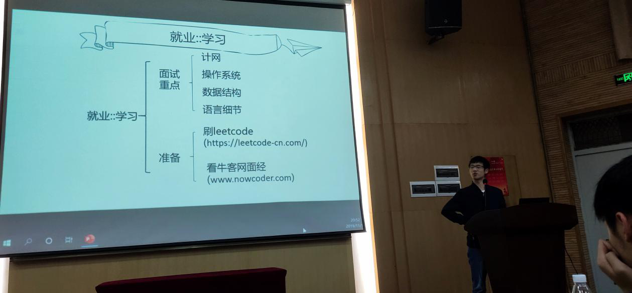 魏学长简洁凝练的宣讲介绍了保研、考研、工作的选择取舍。给我们大学四年大致的阶段性计划提出了建议。并介绍了考研保研所需要做的准备工作。如给了我们选择通识课的建议等。告诉我们班委和学生工作组织能做的工作和应该提升的能力,鼓励我们多出去走走增长见识。