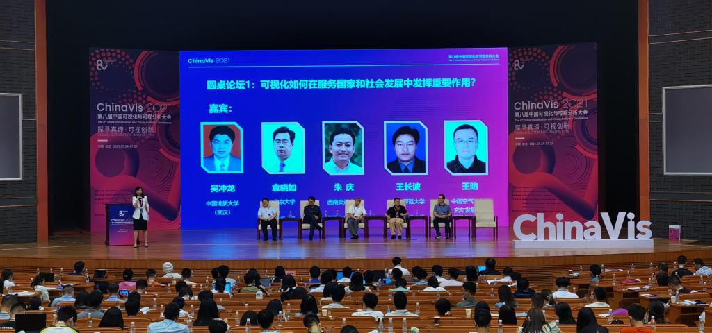 围绕可视化领域的热点问题,大会设置了“可视化如何在服务国家和社会发展中发挥重要作用?”和“可视化领域的就业前景”两个圆桌论坛,探讨可视化前沿新方向和可视化人才培养模式。多位专家介绍了可视化技术如何面向世界科技前沿、面向经济主战场、面向国家重大需求、面向人民生命健康在社会各领域发挥重要作用,结合可视化在城市信息化、地质建模、信息传播、地理测绘、数字化经济、工业软件设计等不同领域的应用展开讨论,围绕可视化领域的就业前景和人才培养等问题各抒己见,最后希望大家抱有家国情怀,共同推进可视化社区的发展,贡献于祖国的科技事业。
