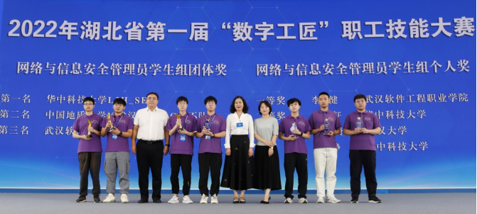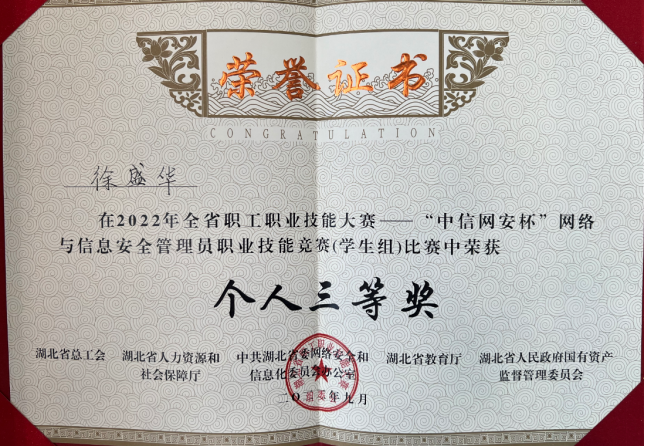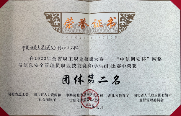 近日,从2022年湖北省第一届“数字工匠”技能大赛暨“中信网安杯”网络与信息安全管理员职业技能竞赛组委会获悉,由今年会信息安全系朱静老师指导的“Flag又不队”战队(队员:覃程伟、孙升阳、张涛)以总分第二名的成绩荣获团体攻防对抗赛学生组二等奖,由马钊老师指导的“Flag对不队”成员徐盛华以总分第六名的成绩斩获个人综合靶场赛学生组三等奖。
