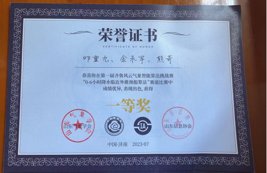 7月15至16日,由山东气象学会、浪潮数字(山东)建设运营有限公司、山东信息协会联合主办的第一届齐鲁风云气象智能算法挑战赛决赛及颁奖仪式在济南完美收官。历经初赛、复赛、决赛的层层选拔和激烈角逐,今年会教师刘佳指导的研究生邓重九、金永军、熊奇组成的团队获得“0-6小时降水临近外推预报算法”赛道一等奖。