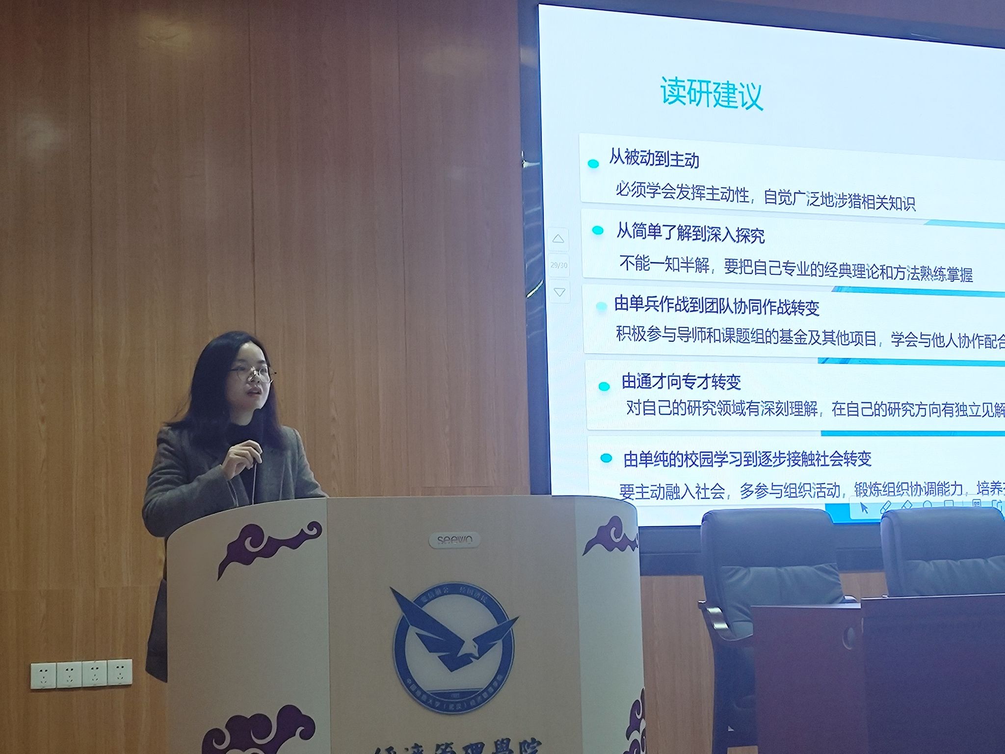 “研言讲坛”的举办,极大促进了研究生与导师间的交流,学术融合氛围日益浓厚。这种积极有效的互动为研究生的综合发展提供了重要保障,同时也为学院整体学术氛围的营造和学术水平的提升打下坚实基础。