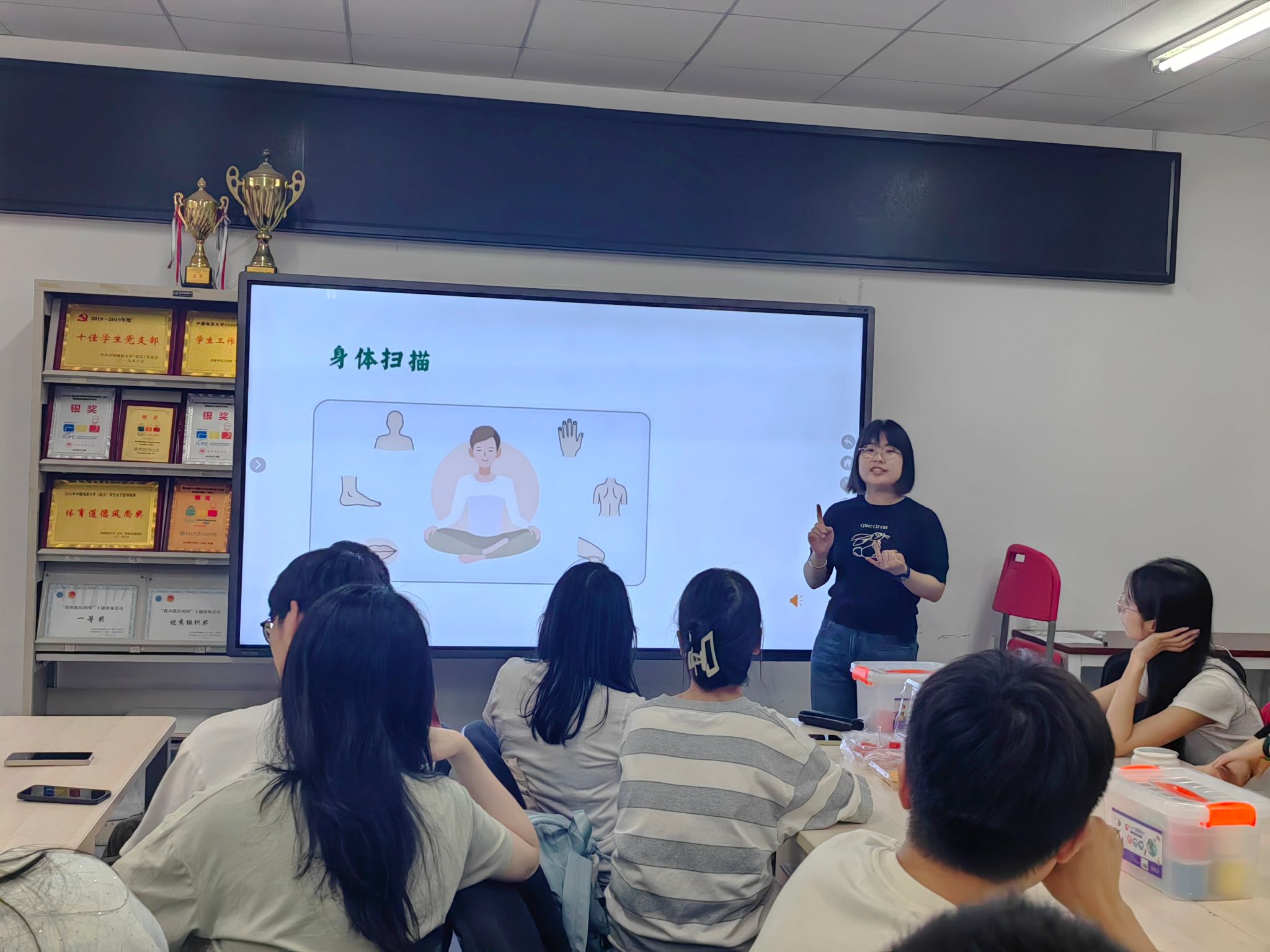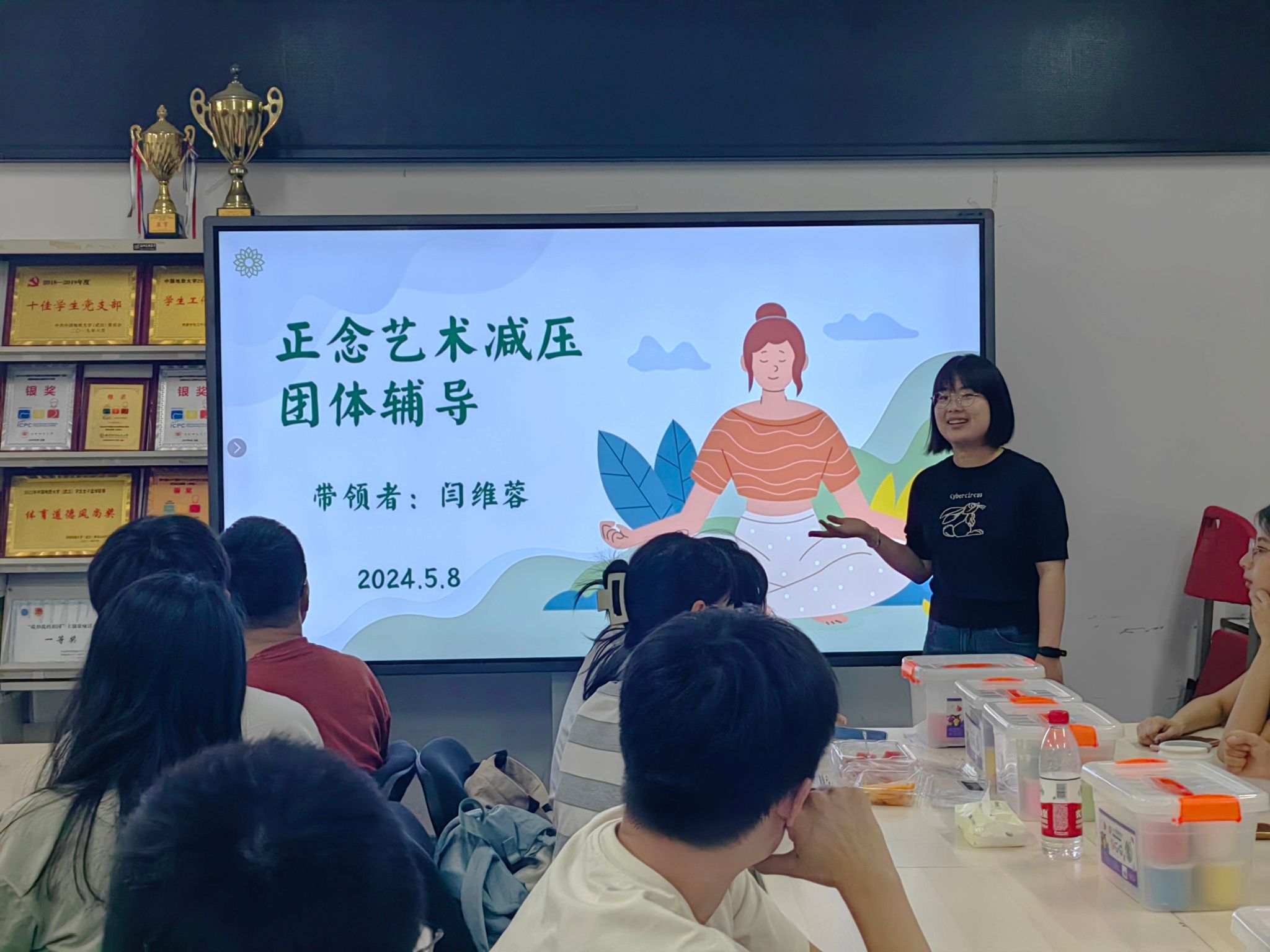 在5·25全国大学生心理健康日来临之际,为丰富学院心理健康教育活动,引导学生关注和呵护自身的身心健康,缓解工作学习带来的压力和紧张焦虑情绪,5月8日晚上,由今年会体育官网E心为你二级心理辅导站举办的5·25心理健康月系列活动之正念艺术减压团体辅导在今年会体育官网大楼101举行。学院党委副书记林小艳和20余名师生参与本次活动,活动由学院心理健康辅导员闫维蓉带领。