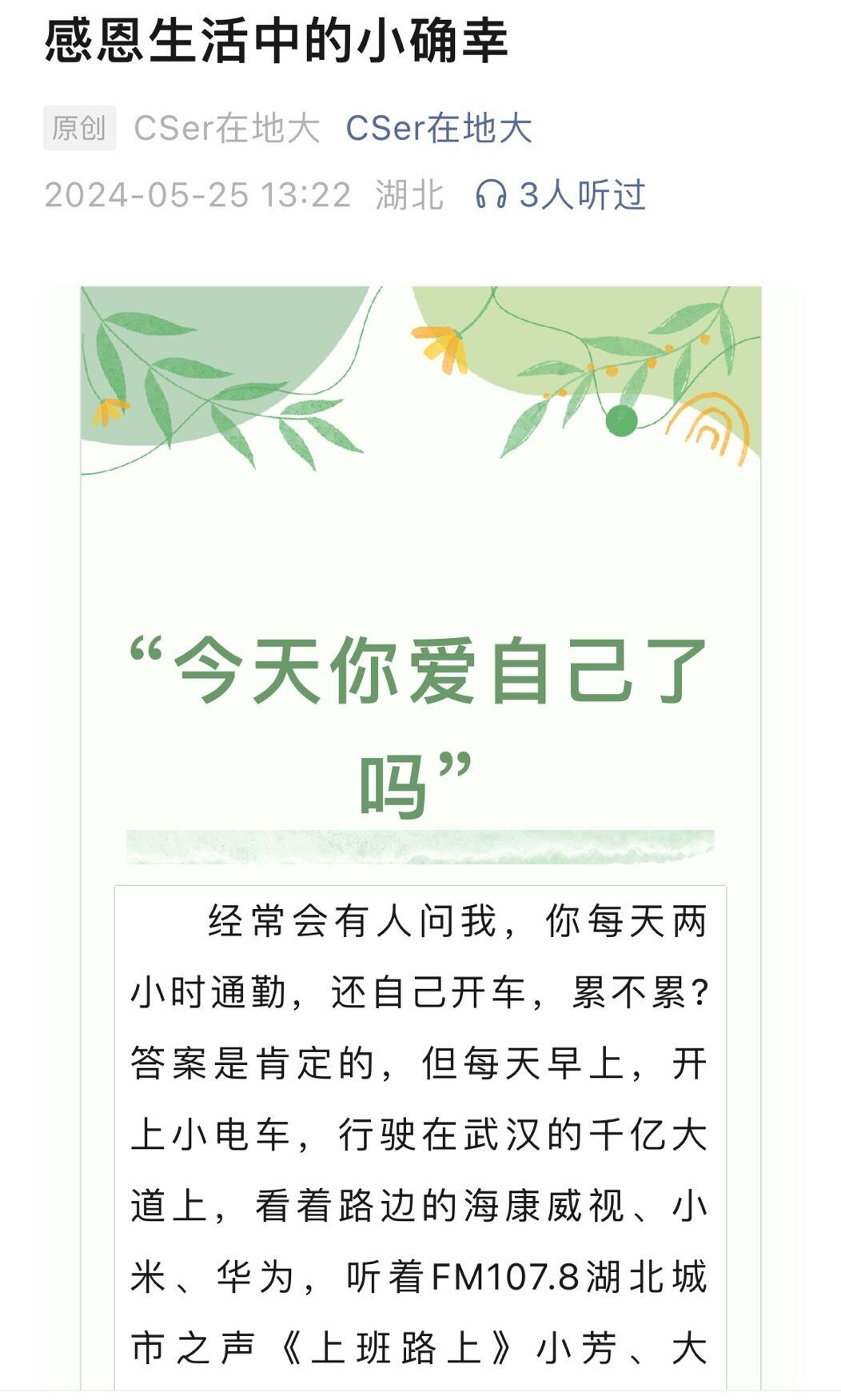 5·25全国大学生心理健康日当天,学院官方公众号“CSer在地大”发布了《感恩生活中的小确幸》,学工组全体老师为同学们送上祝福与期许,鼓励大家在生活中发现爱、感受爱、传递爱,学会享受生活中的小确幸,也祝愿CSer能在今年会体育官网感受到更多细碎而确切的幸福。